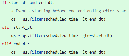 However, the first if statement, which is supposed to check both start_dt and end_dt, only checks for end_dt! We’re not filtering based on start_dt at all and eventually we’re going to crash the front end by asking it to render a thousand events at once. We only had 2 events in the database this time so we didn’t notice the issue.